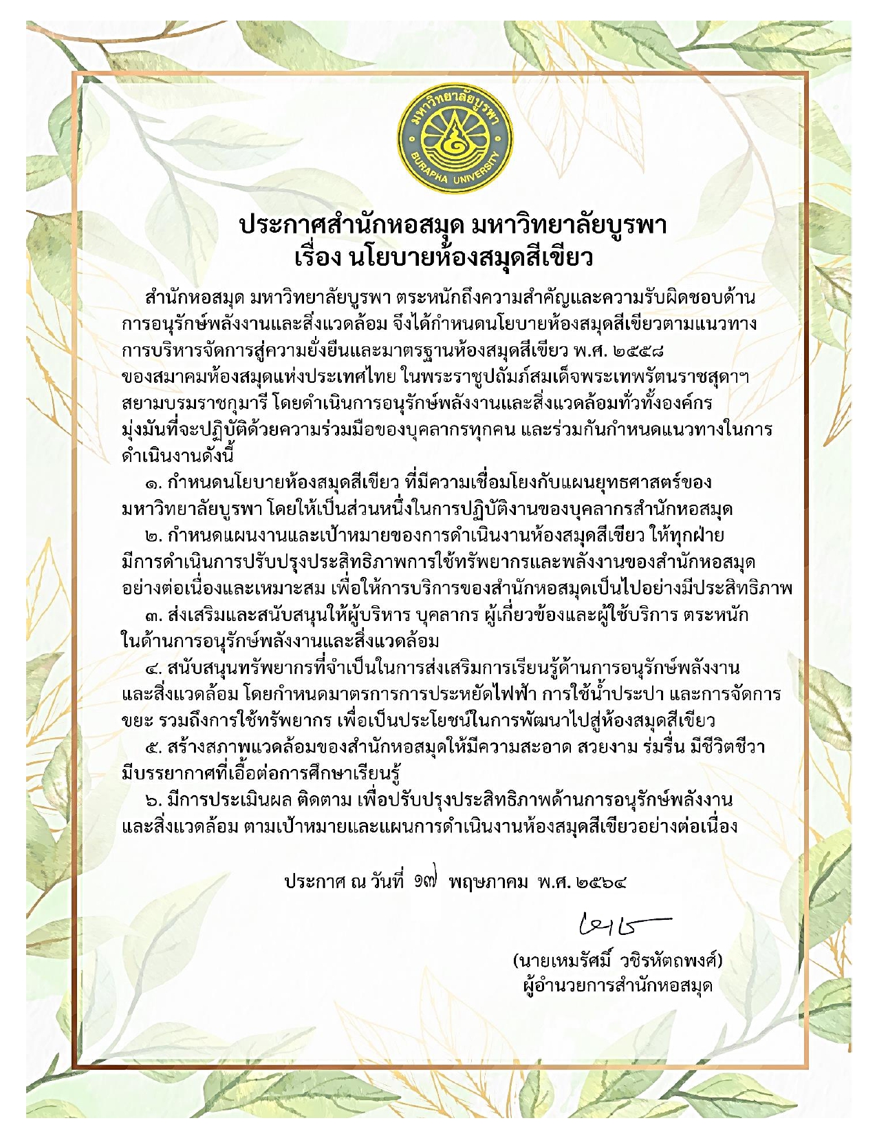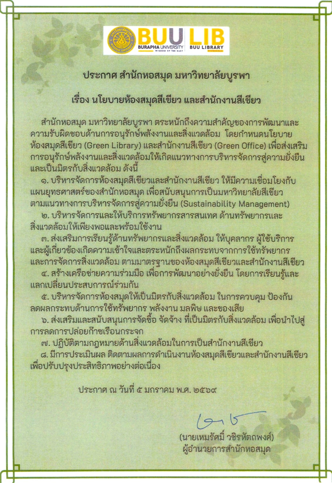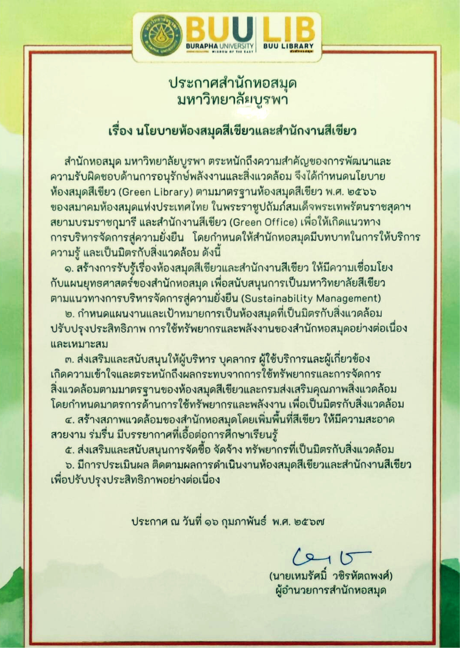 นโยบายห้องสมุดสีเขียวและสำนักงานสีเขียวปี 2569 นโยบายห้องสมุดสีเขียวและสำนักงานสีเขียวปี 2567 นโยบายห้องสมุดสีเขียวและสำนักงานสีเขียวปี 2564
