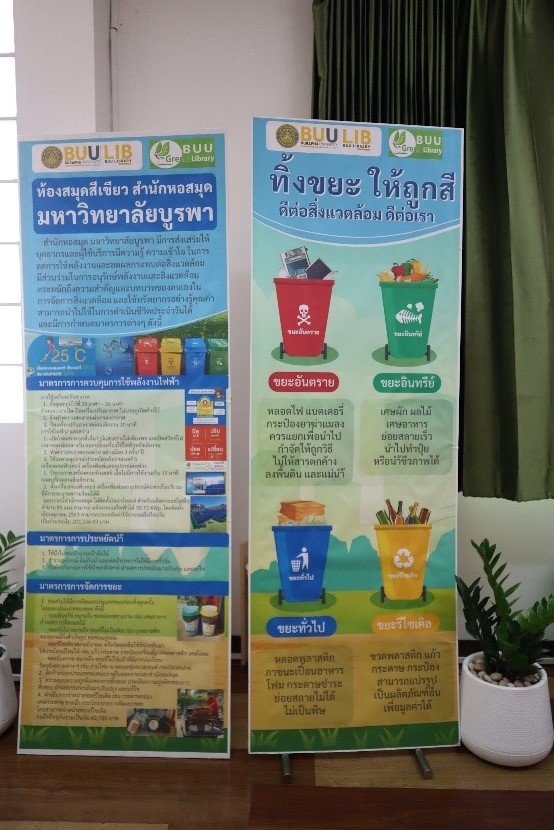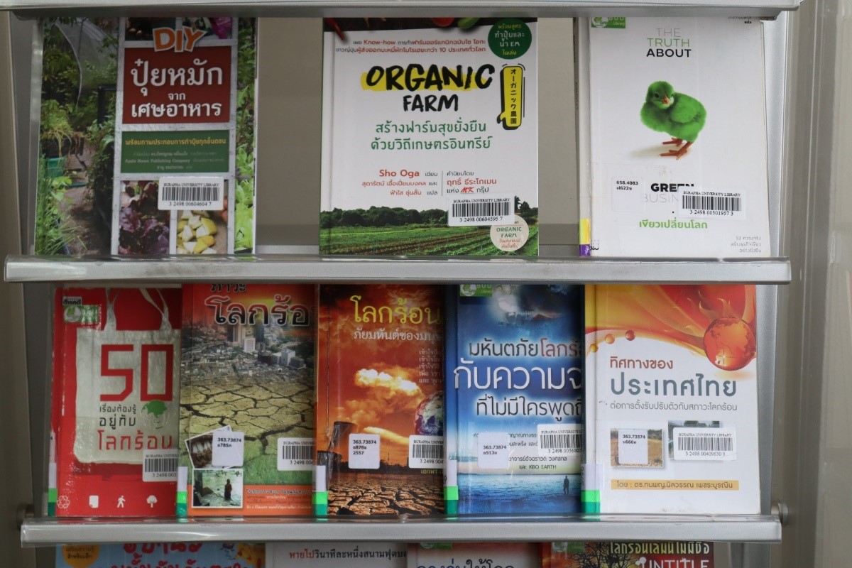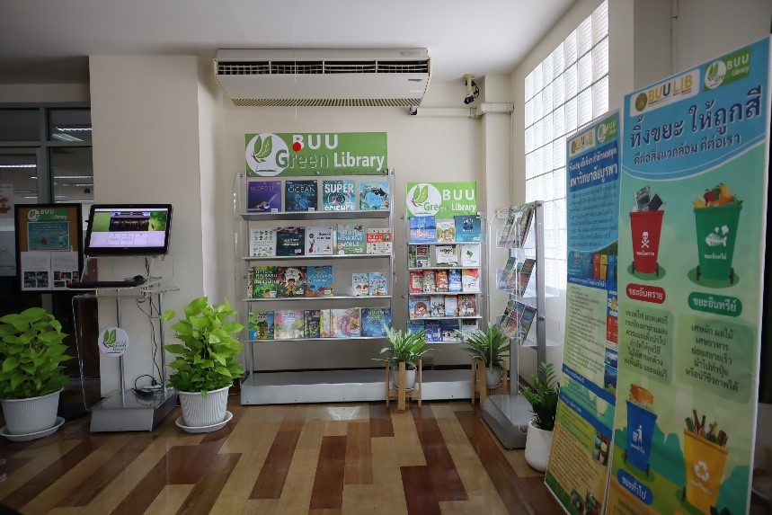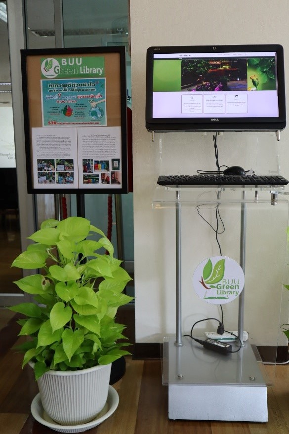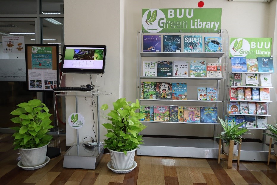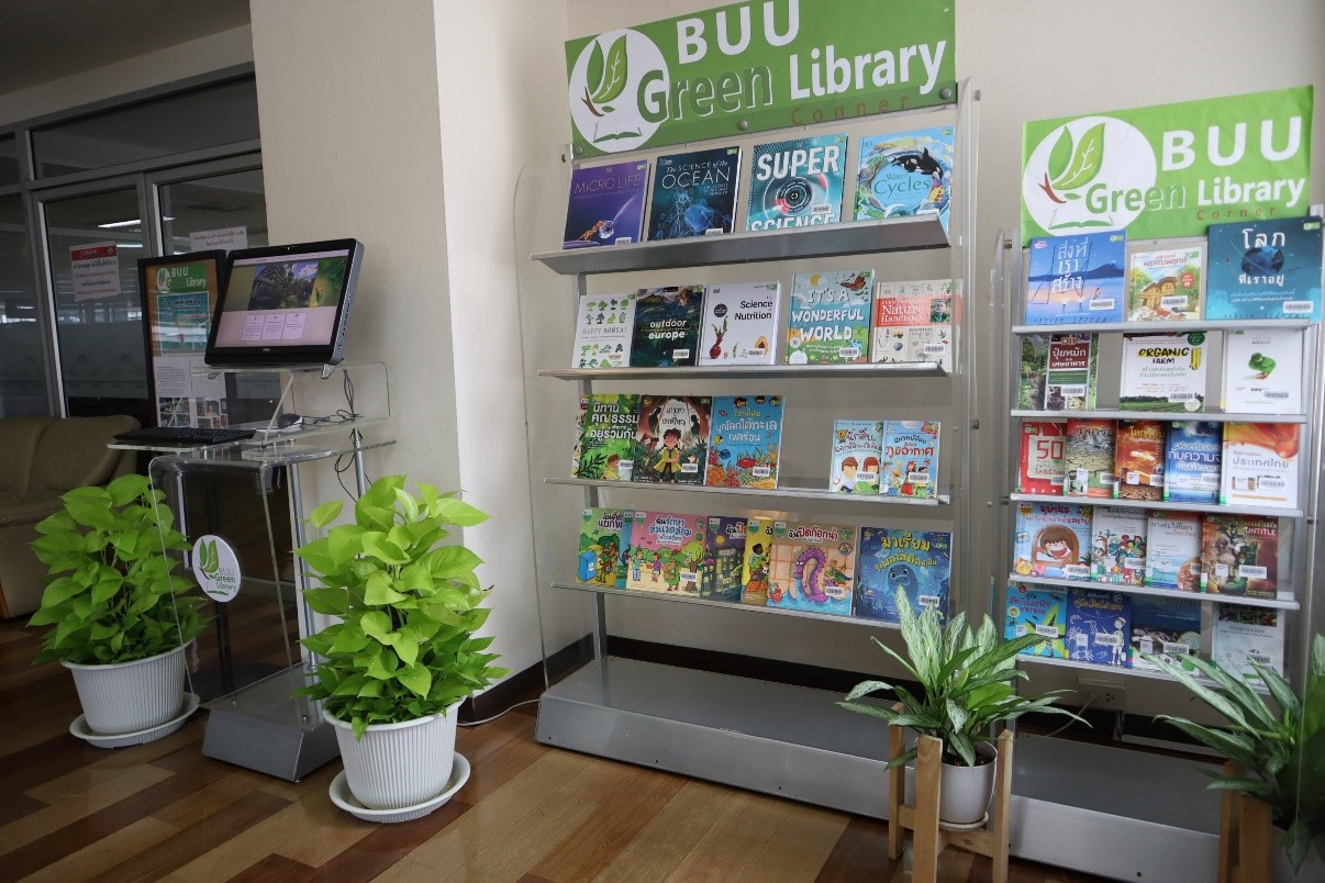 สำนักหอสมุดจัดทำ มุม Buu Green library เพื่อรวบรวมทรัพยากรสารสนเทศที่เกี่ยวกับสิ่งแวดล้อมและการอนุรักษ์พลังงาน โดยนำเสนอแบบหมุนเวียน ให้บริการแก่ผู้ใช้บริการที่ชั้น 3 นอกจากนี้ยังได้มีการแนะนำข่าวสารสิ่งแวดล้อมและกิจกรรมต่างๆ ที่เกี่ยวข้องกับสิ่งแวดล้อมของสำนักหอสมุด